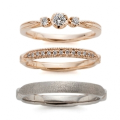 こちらのセットリングはフランスのお菓子、ガレット デ ロワ をイメージしたデザインとなっています。「ガレット デ ロワ」は王様のケーキという意味で、リング全体に美しい模様が描かれており、リングのどこを眺めていただいても飽きません。