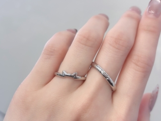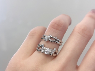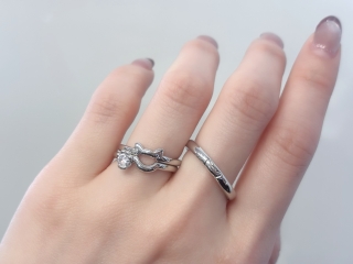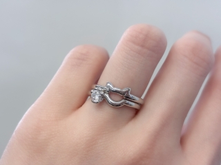 ポイントは、ネコ耳の結婚指輪を上に、婚約指輪を下に重ねて着けることです。