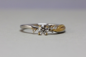 元々はPt950をベースに、センターダイヤとメレダイヤモンドの石枠、そして葉っぱをデザインしたパーツのみK18YGでおつくりしたコンビネーションリング。パーツパーツでのゴールド素材はデザインにアクセントを生み、華やかな雰囲気のある婚約指輪です。セミオーダーにて素材を全てPt950でおつくりすると、デザインが引き締まり一気に婚約指輪らしい雰囲気になりますね。ダイヤモンドとの輝き方も既存デザインではK18YGとダイヤモンドでコントラストがでており、よりダイヤモンドの存在感があります。Pt950のみでおつくりした場合は、プラチナとダイヤモンドの輝きがよく馴染み繊細な輝きを放ちます。すっきりとした雰囲気がお好みの方はプラチナのみでのおつくりをおすすめいたします。