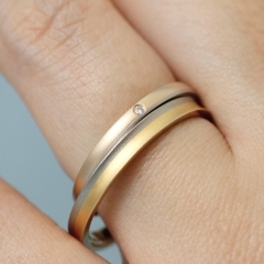 デザインとしては、2本のリングを重ねるとプラチナのアシメントリーなラインが途切れなくぐるりと一周回ります。