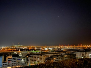 夜になるとベイブリッジのライトやみなとみらいにある観覧車などが
