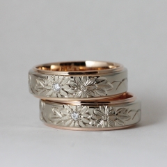 ☞ホワイトゴールド×ピンクゴールドのコンビネーション素材で、リング幅は6mm。8mm幅のオーダーも可能です。表面には熟練の職人による手彫りで美しい花模様が施されています。同シリーズで桜、梅、水仙のデザインもあり。