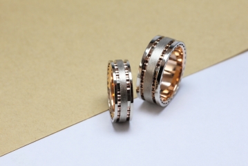 ☞ホワイトゴールド×ピンクゴールドのコンビネーション素材で、透かしの入った近未来的なシルエットの独創美リング。リング幅は6mmと8mmの2タイプ。あたたかな家庭の窓辺ほ光を表現したデザインです。