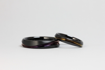 〈Aroode〉にはセミオーダーマリッジリングのシリーズがありプラチナやゴールド素材の他に、チタンやジルコニウムでもオーダーいただけます。ジルコニウム素材では多彩なカラーバリエーションがあり、ブラックリングとして選ぶこともできます。