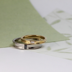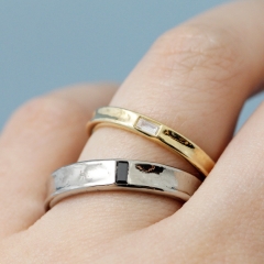 イエローゴールドのリングにはホワイトダイヤ、ホワイトゴールドのリングにはブラックダイヤを留めたカジュアルテイストな結婚指輪。バケットカットのダイヤモンドを使用した都会的な雰囲気で輝きは控えめ。指輪は中央が凹んだようなストレートラインのシルエットで、表面の潤んだような質感が特徴です。