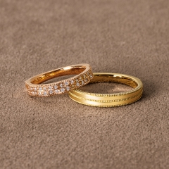 ピンクゴールドのリングは一見シンプルなストレートリングですが、側面から見るとふらふわと曲線を描いた立体感のあるフォルム。リングの縁にはミル打ち、メレダイヤは2段で留められており華やかながらも細身のリングを重ね着けしたかのような繊細な印象もあります。ペアのリングは幅のあるすっきりとしたストレートラインにミル打ちが縁とリング中央の3列に施されています。シンプルながらもペア感を感じられる工夫がされています。