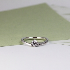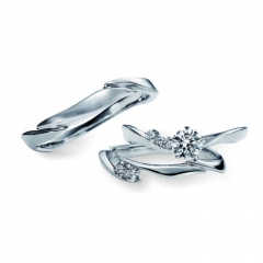 アシンメトリーで有機的なフォルムが魅力で婚約指輪とメレダイヤありタイプの結婚指輪に散りばめるように留められたメレダイヤが特徴。メレダイヤなしタイプの結婚指輪はやや幅があり、表面のヘアーライン仕上げと相まって落ち着いた中にも格好良さを感じられるリングです。