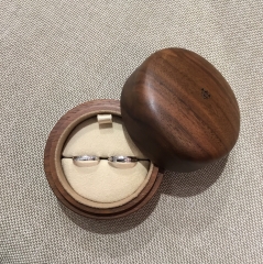 リングケースがとても特徴的で、くるみの木でつくられた木のぬくもりを感じられる温かみのあるケース。くるみの木は古代ギリシャの時代に五穀豊穣、子孫繁栄を願うお守りとして使用されていたことと、木材として重厚で衝撃に強く大切な指輪を収めるケースとして相応しいということから選ばれました。一つとして同じものがない木の色合いや木目、可愛らしい丸みのあるフォルムに愛着がわきます。