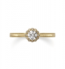 取り巻きのメレダイヤに直径0.7mmの小さなサイズを使用した〈ORECCHIO~Concerto collection~〉のアンティークテイストの婚約指輪。ゴージャスなデザインが多い取り巻きタイプですが、小さなミルと小さなメレと合わせることで繊細な印象に仕上げています。