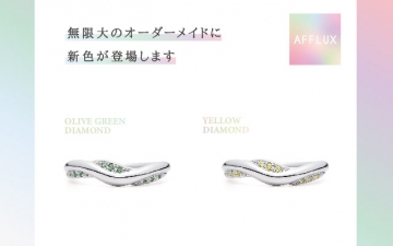 こちらも現在〈AFFLUX〉のみでお取り扱いしており、抹茶のような深い色味のオリーブグリーンダイヤをご紹介しています。グリーンには「自由」「自分らしい変化・成長」という心理的な意味があり、同ブランドの新色ながらも男女問わず人気のカラーです。