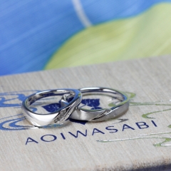 お選びいただいた指輪は、オリジナルの風呂敷にお包みしてご納品。結婚後も使えるアイテムとして人気です。〈葵山葵-AOIWASABI-〉は当店セレクトブランドのひとつですが全国でもお取り扱い店舗が少なく、他の人とは違った和のブライダルリングをお探しの方におすすめです。