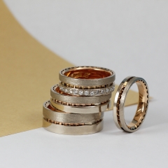 リング幅が4mm・6mm・8mmの展開で、6mm幅のタイプがアレンジでリング表面にメレダイヤを並べて留めることができるエタニティリング。ピンクゴールドとホワイトゴールドのコンビネーション素材であたたかみがあり、幅広タイプながらも優しい印象のリングです。またリング半周のみにダイヤを留めるハーフエタニティにも対応しています。
