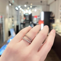 ストレートラインが多いエタニティリングですが、こちらのデザインは緩やかなウェーブラインを描く繊細で優しい雰囲気のリング。隣のダイヤと同じ爪を共有して留める“共有爪留め”という留め方でメレダイヤを留めておりダイヤモンドの存在感が際立つとともに、リング側面から見た際の爪留めの美しさも魅力のひとつです。