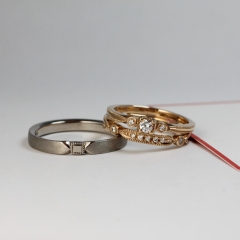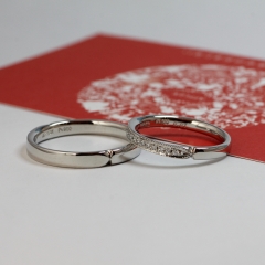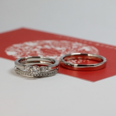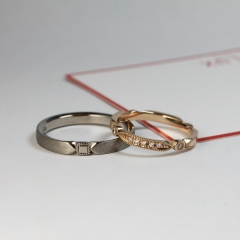 結婚指輪(マリッジリング)はミル打ちが施された、メレダイヤを留めたピンクゴールドのリングと、ダイヤなしのホワイトゴールドのリング。ホワイトゴールドのリングはグロス仕上げとダイヤバー仕上げのコントラストが目を引くデザインで、正面のミル打ちを施したパーツが程よいアクセントとなっています。